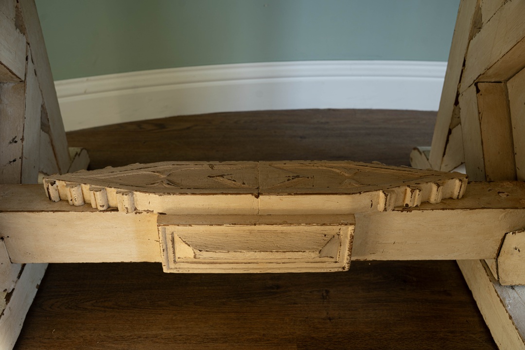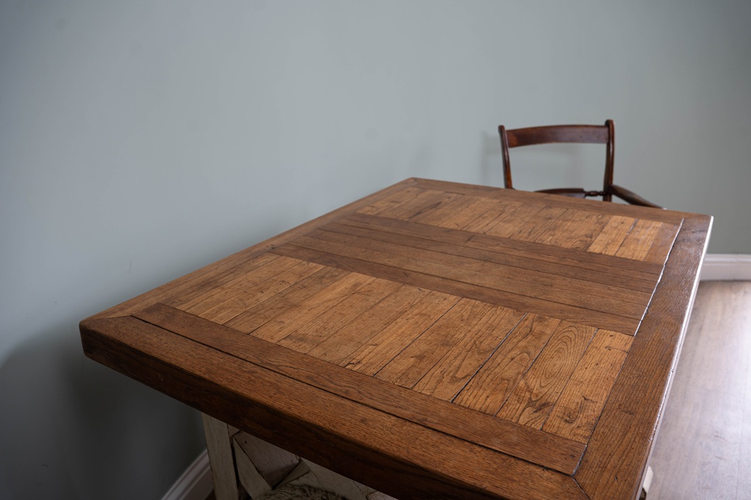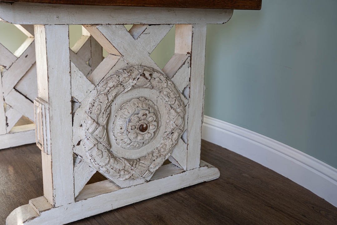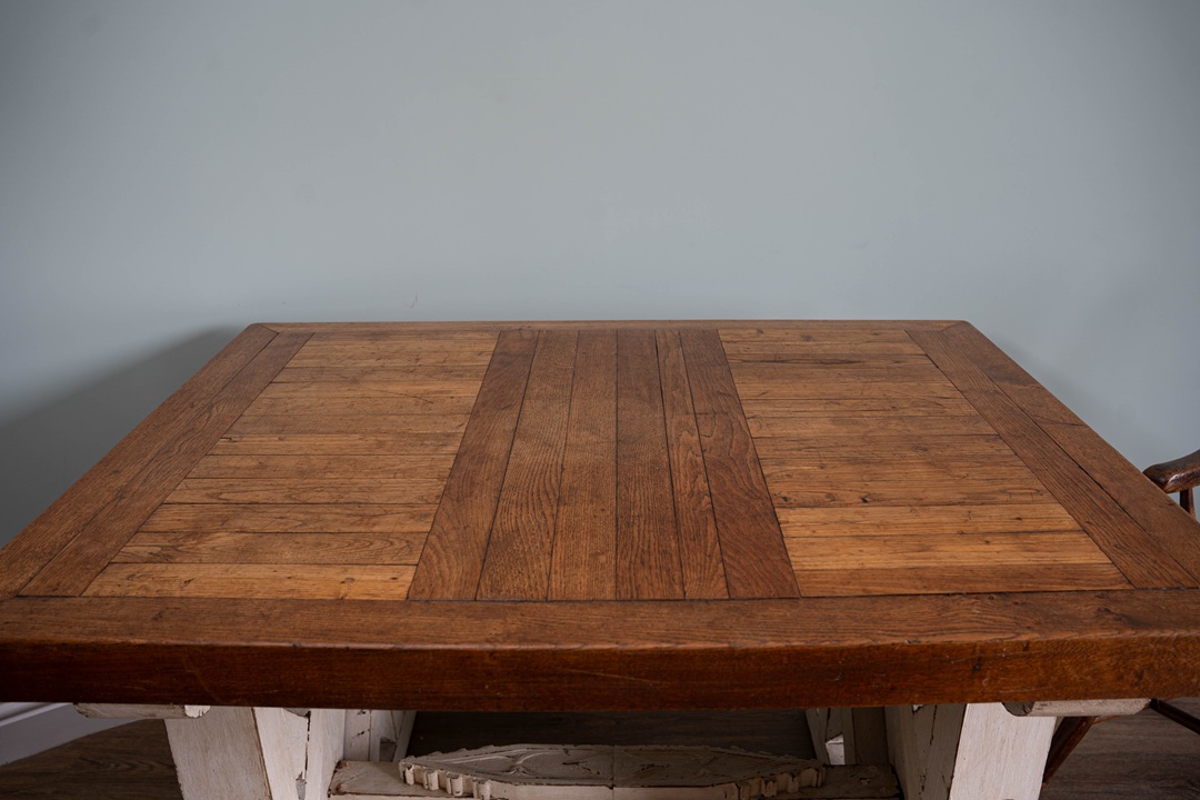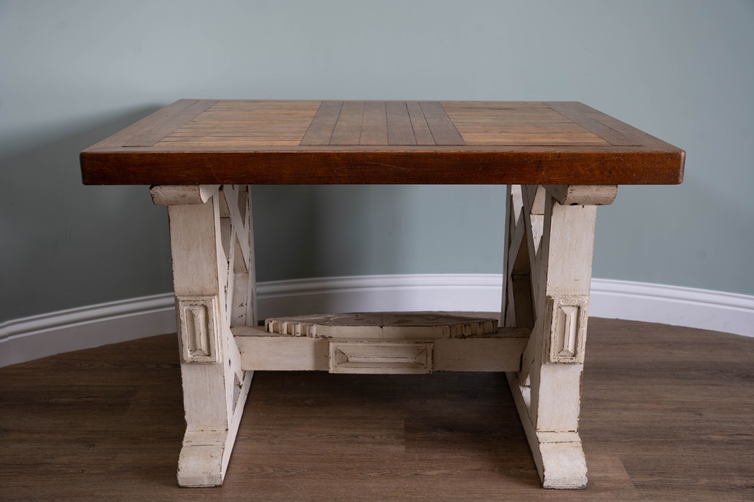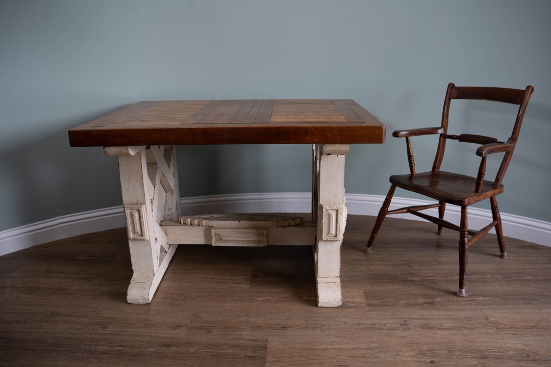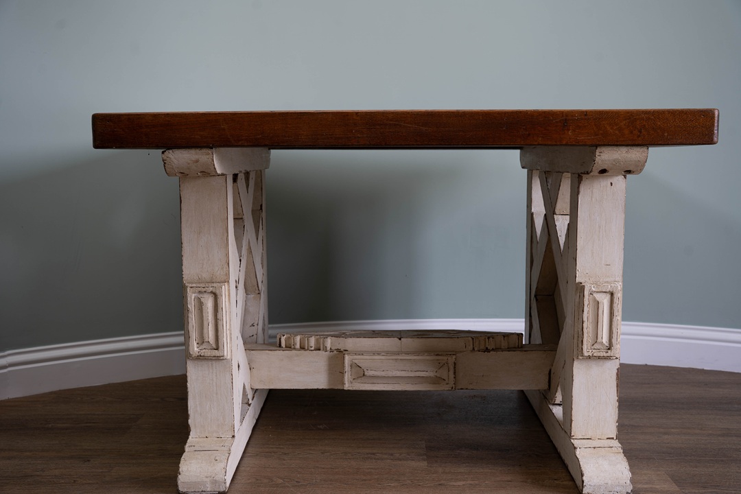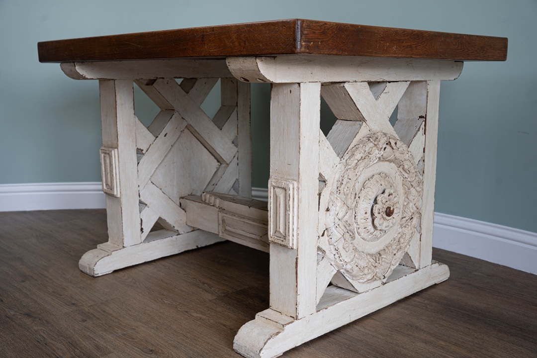 A handsome table that would work equally well in a conservatory or inside the home. Circa 20th century, the slatted rectangular top (which is moveable), is raised on a carved and painted trestle ends. A heavy, solid oak table.