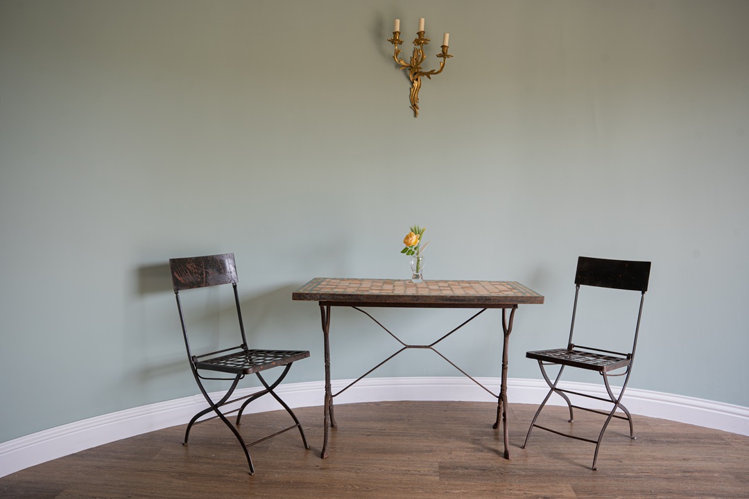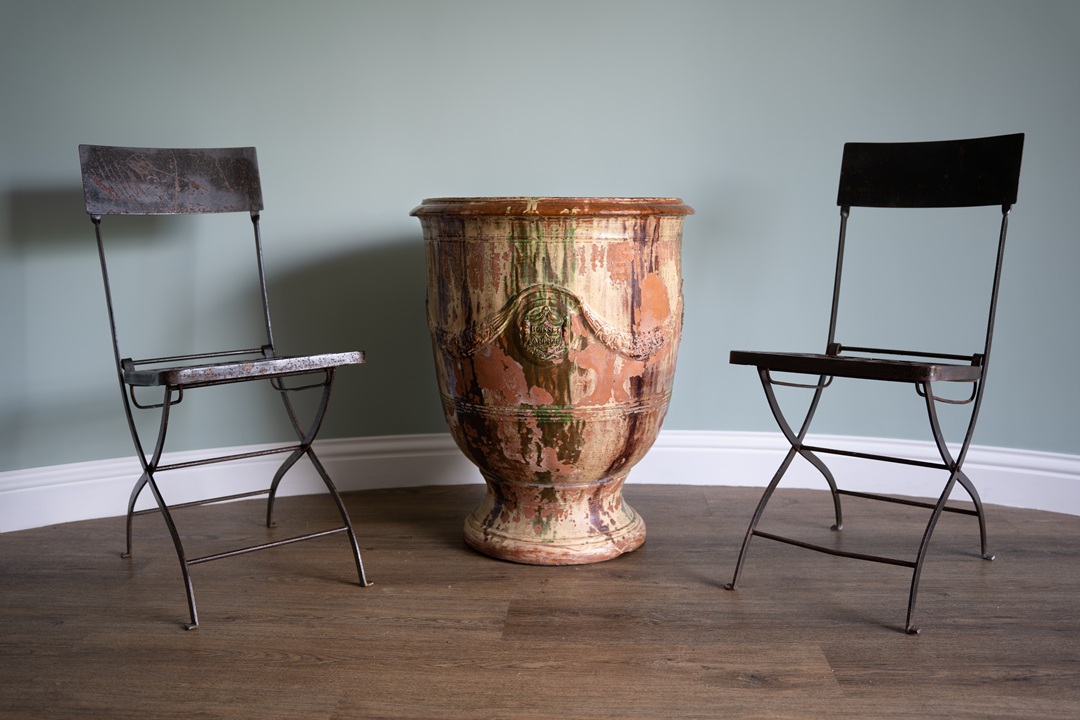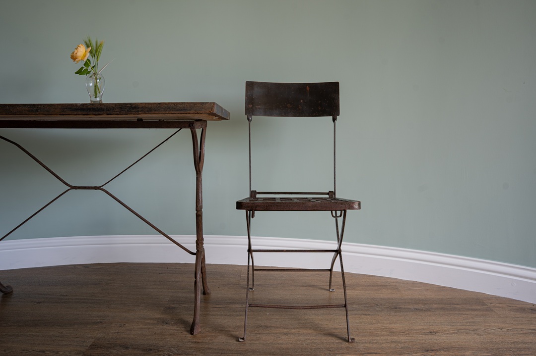Good quality, sturdy pair of antique iron collapsable garden chairs with slatted backs and seat and X-shaped supports. Perfect for those tight spaces and excellent way to store your garden furniture during the winter months. Extremely well-made solid garden seats. Seat height measures a standard 42cms.