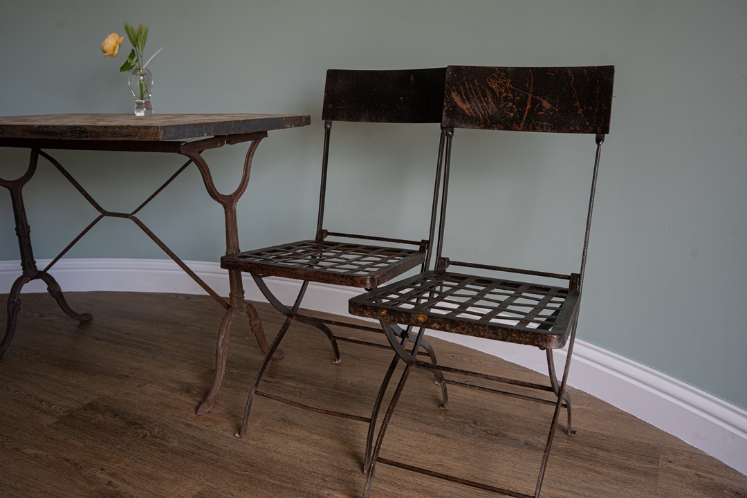 A pair of antique iron folding garden chairs