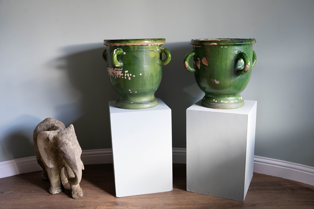 A pair of striking four-handled Castelnaudary terracotta vases, finished in a rich emerald glaze and standing approximately 47cm (19 inches) high. This antique Anduze garden vase features a timeless design, with four handles positioned around the upper section of its generously proportioned body.