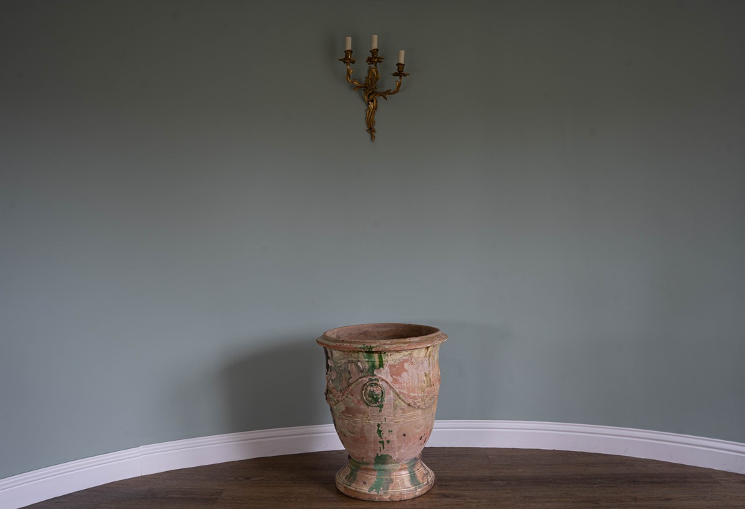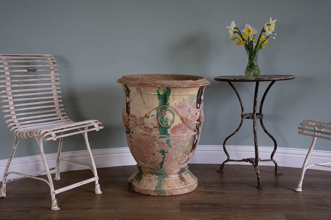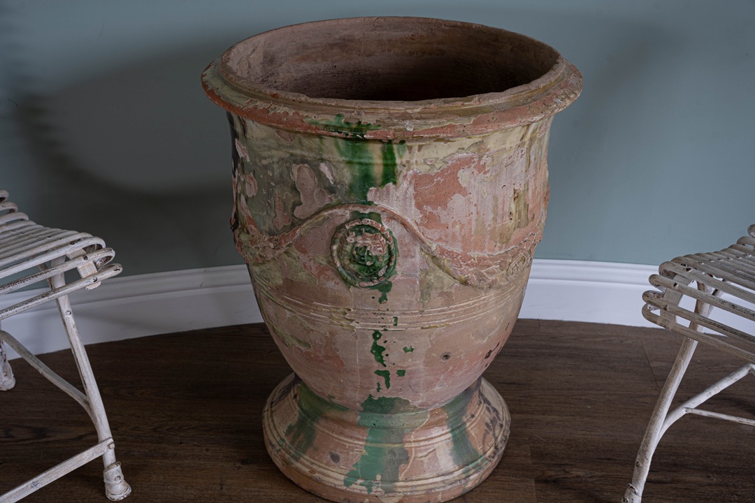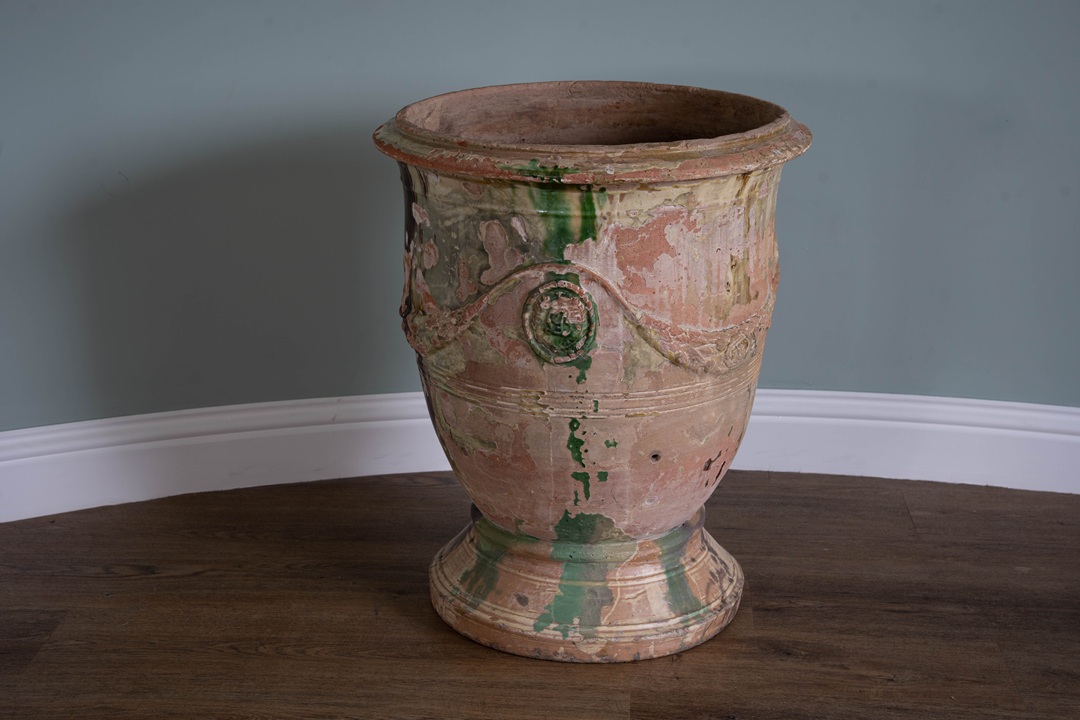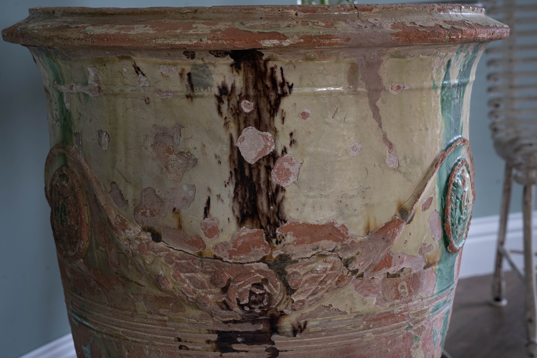 Really beautiful antique Anduze vase from South of France with excellent patina of mellow yellow,  brown and green glaze. We are such a fan of these antique pots from France and firmly believe that age becomes them! The classic Anduze vase is a celebrated 17th-century French terracotta planter from the town of Anduze in the Gard region. Recognizable by its inverted bell shape, these handcrafted, glazed urns are adorned with signature garlands and medallions. They were originally created to hold citrus trees at Versailles and are distinguished by their traditional green, yellow, or brown flamed glazes.