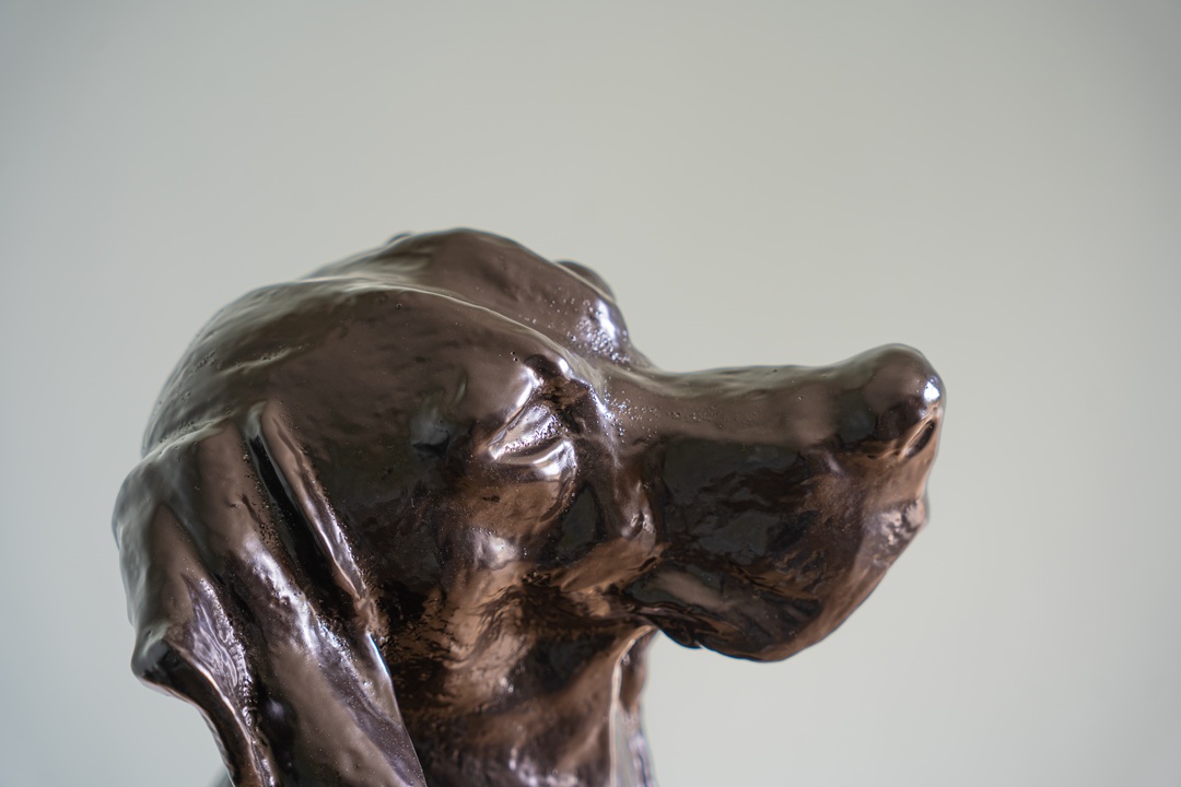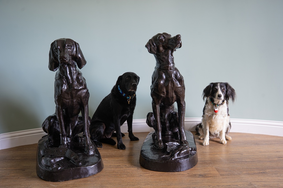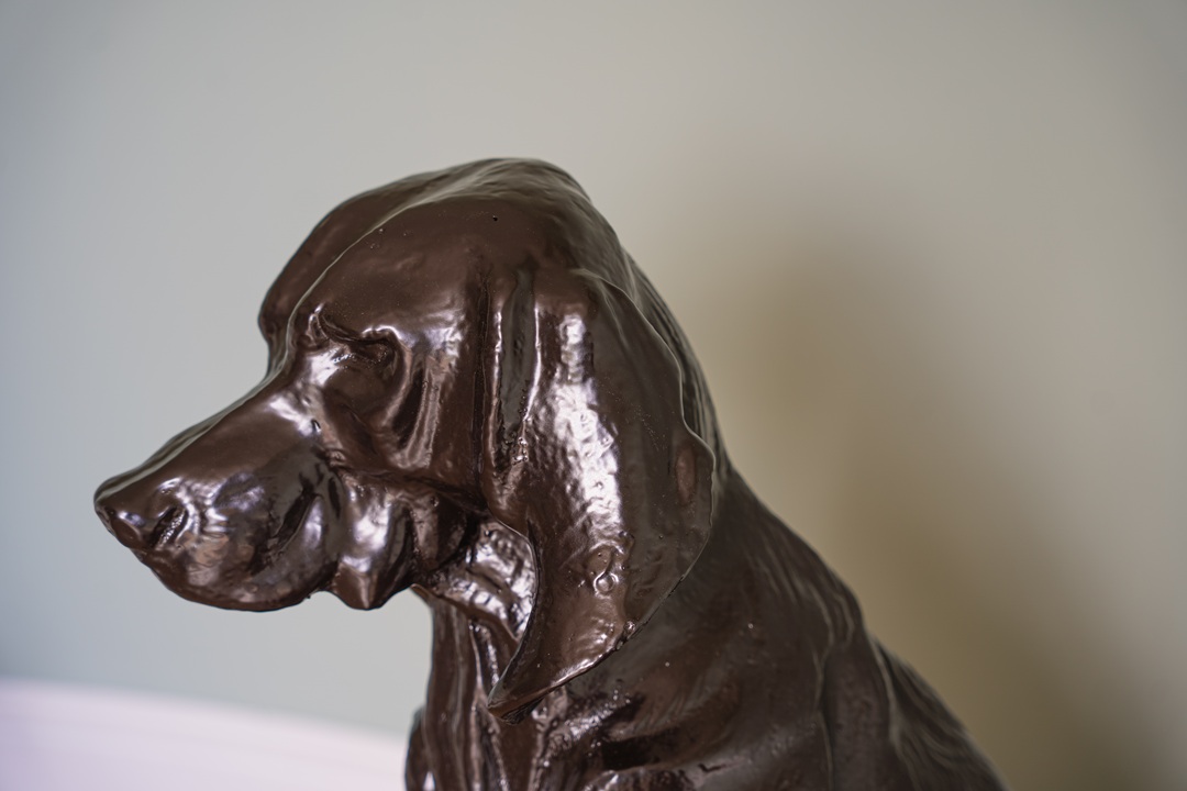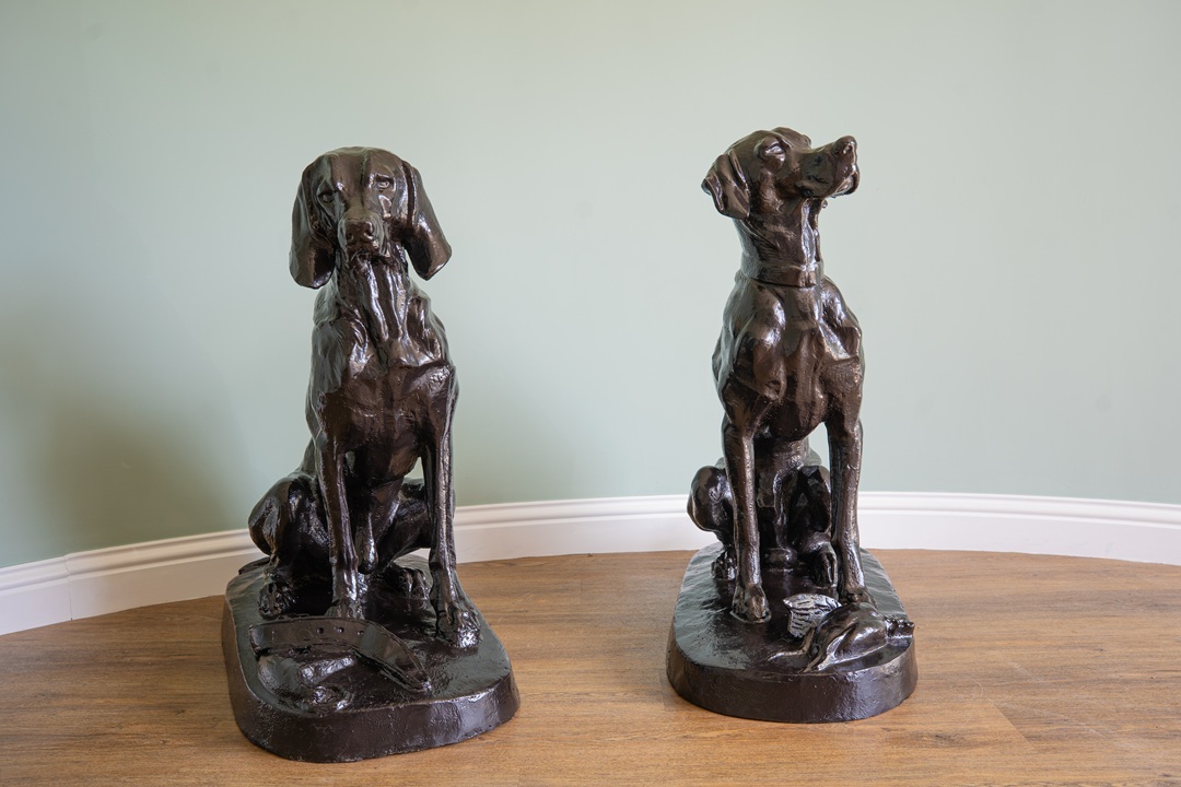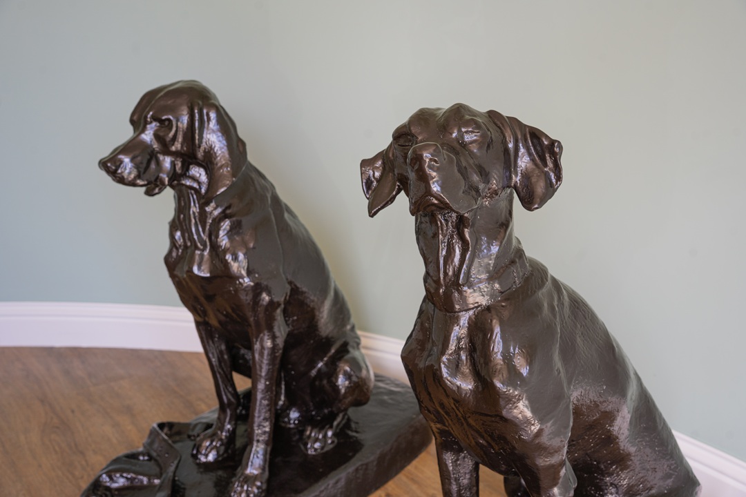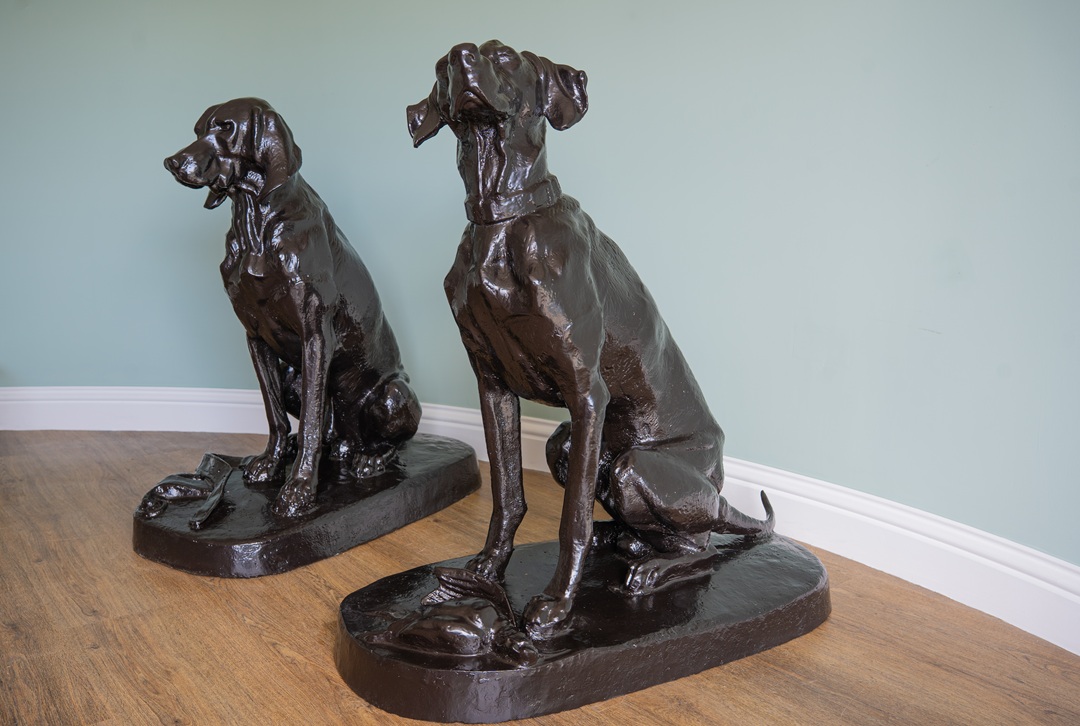 A pair of decorative, cast iron garden dog statues. We have repainted these hound statues in a dark brown paint and are ready for a new home!