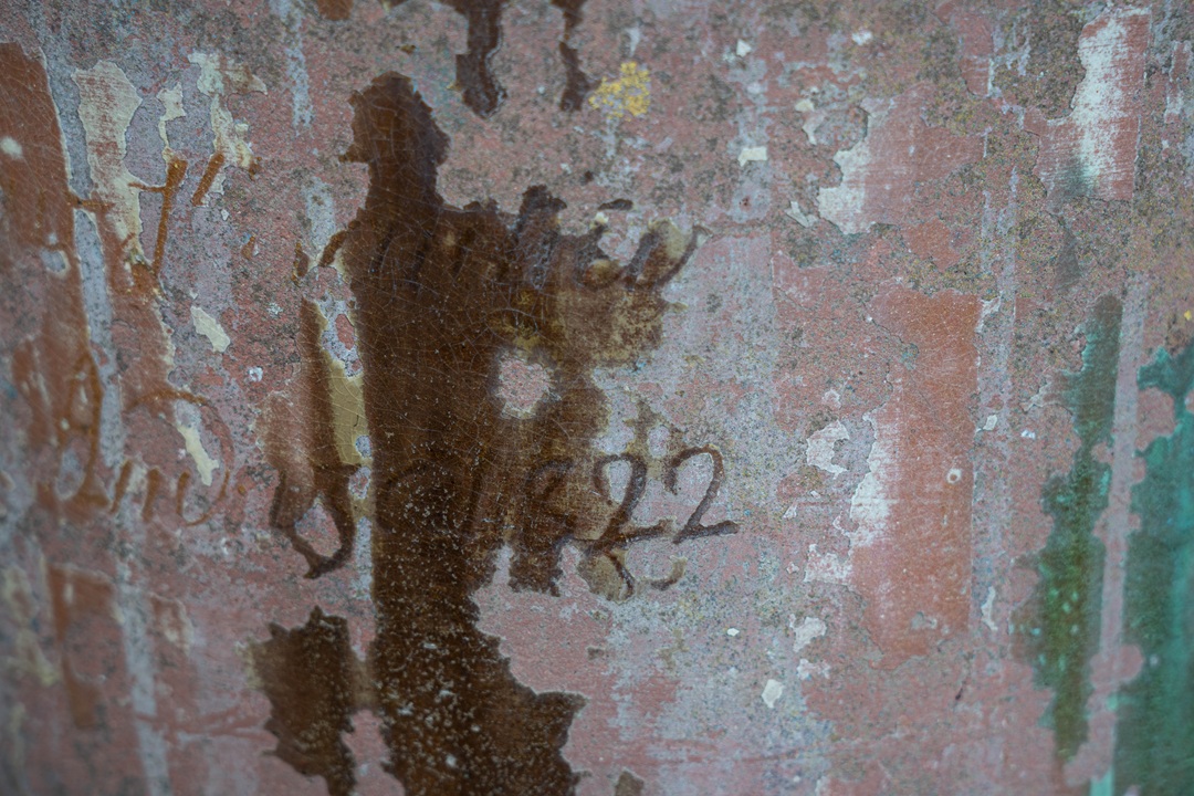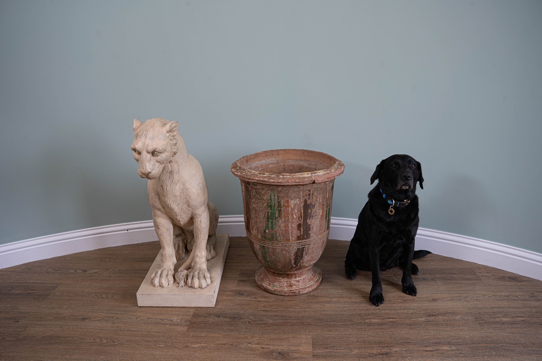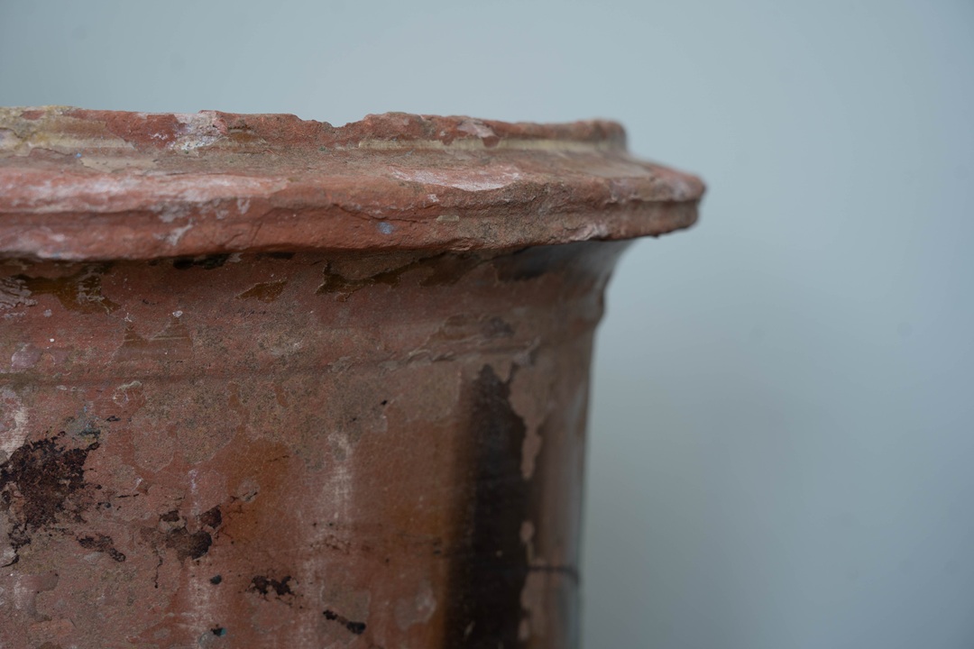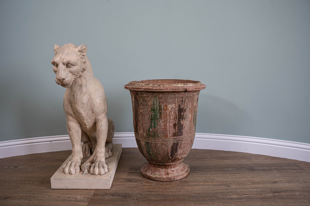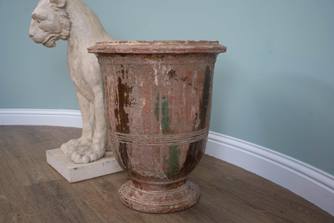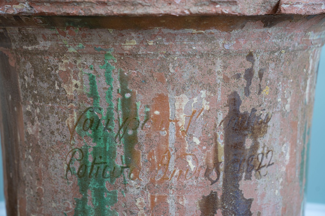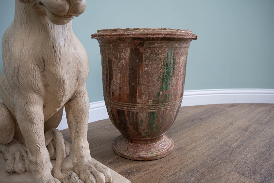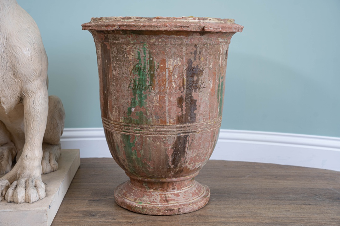 An exceptionally rare antique Anduze vase inscribed 1822 on its terracotta body. I am a big fan of antique Anduze pottery. The simple, classical shape together with the earth toned colours of browns, ochres and mellow yellow glaze, makes it a hit for the garden and the home. Being such a statement piece, this would sit most beautifully inside a home to maintain its heritage and to be protected by the harsh British winters.