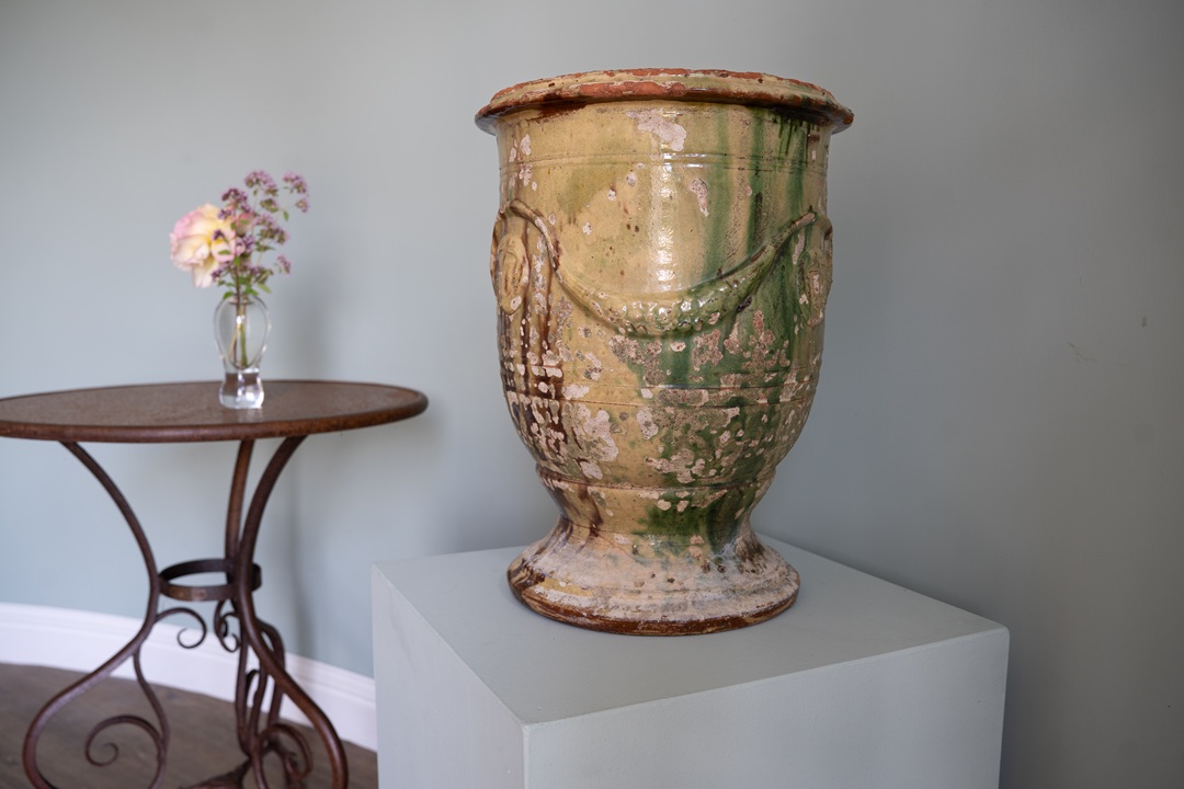 An extremely attractive decorative antique vase for the home or garden. This is from the iconic Anduze range of French antique pottery. I haven’t come across an Anduze French vase this small and it packs a small but extremely pretty punch! With colours of greens, yellow and brown hues, some of the glazing has disappeared in time, which I feel makes this antique vase more attractive with age.
