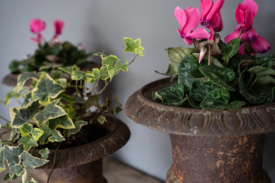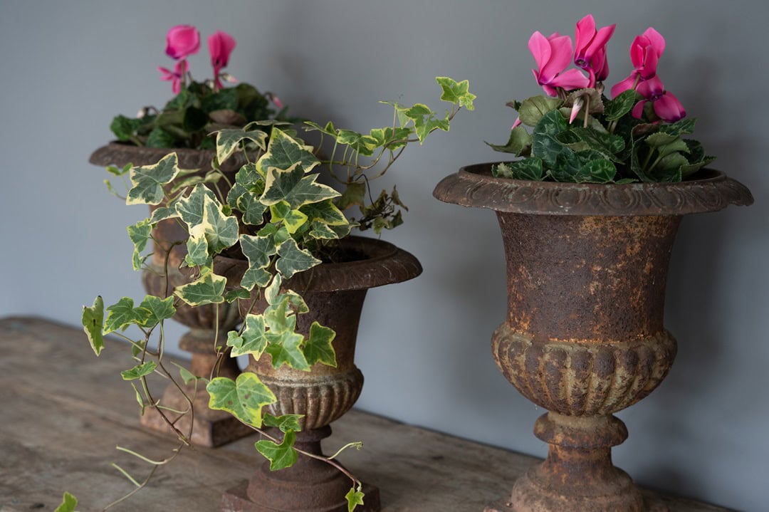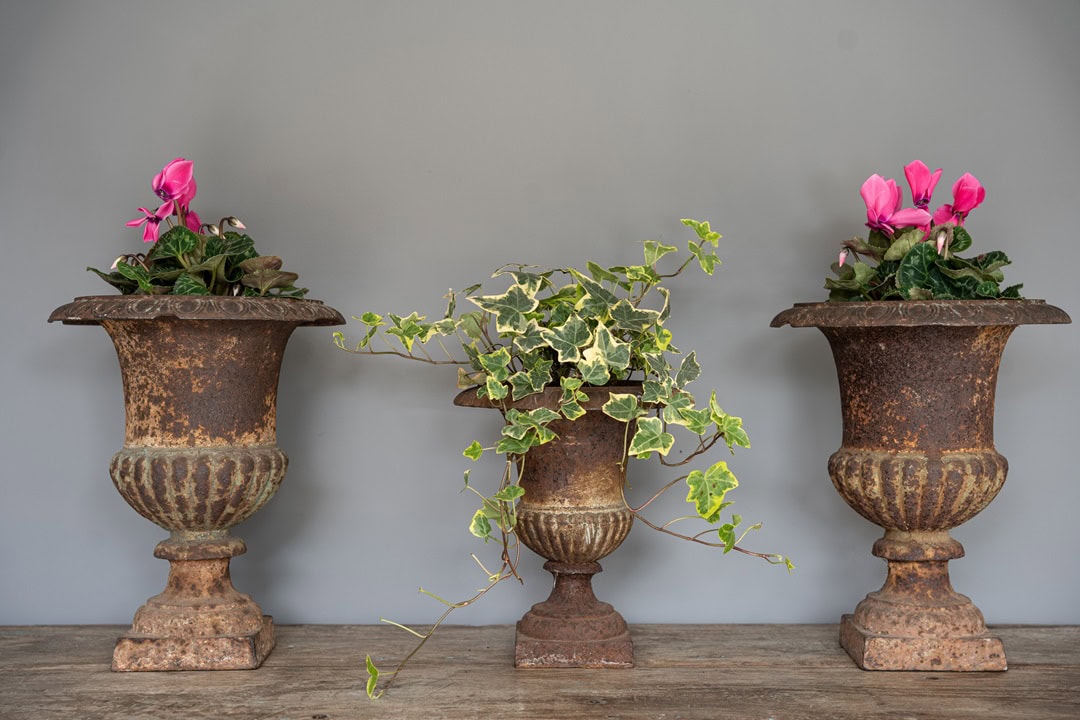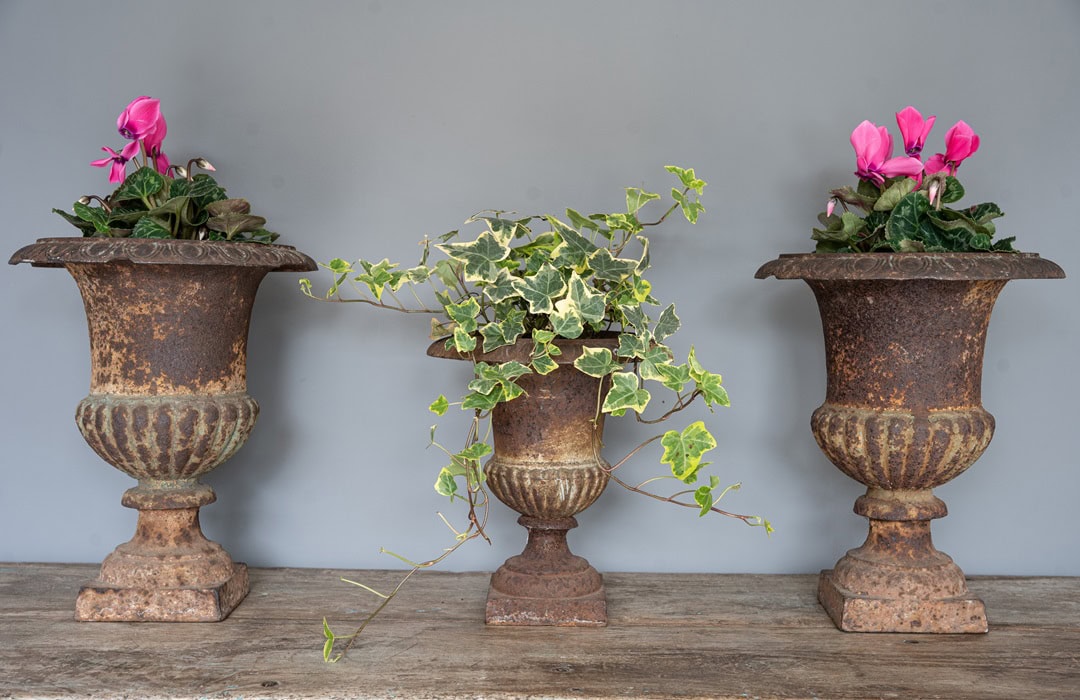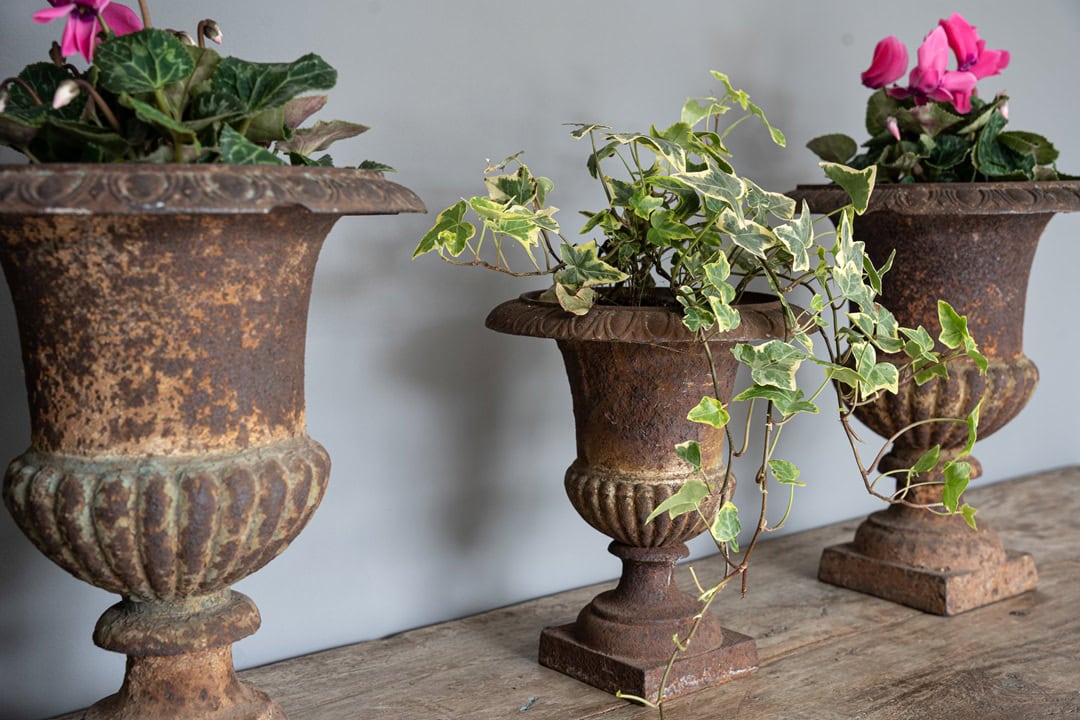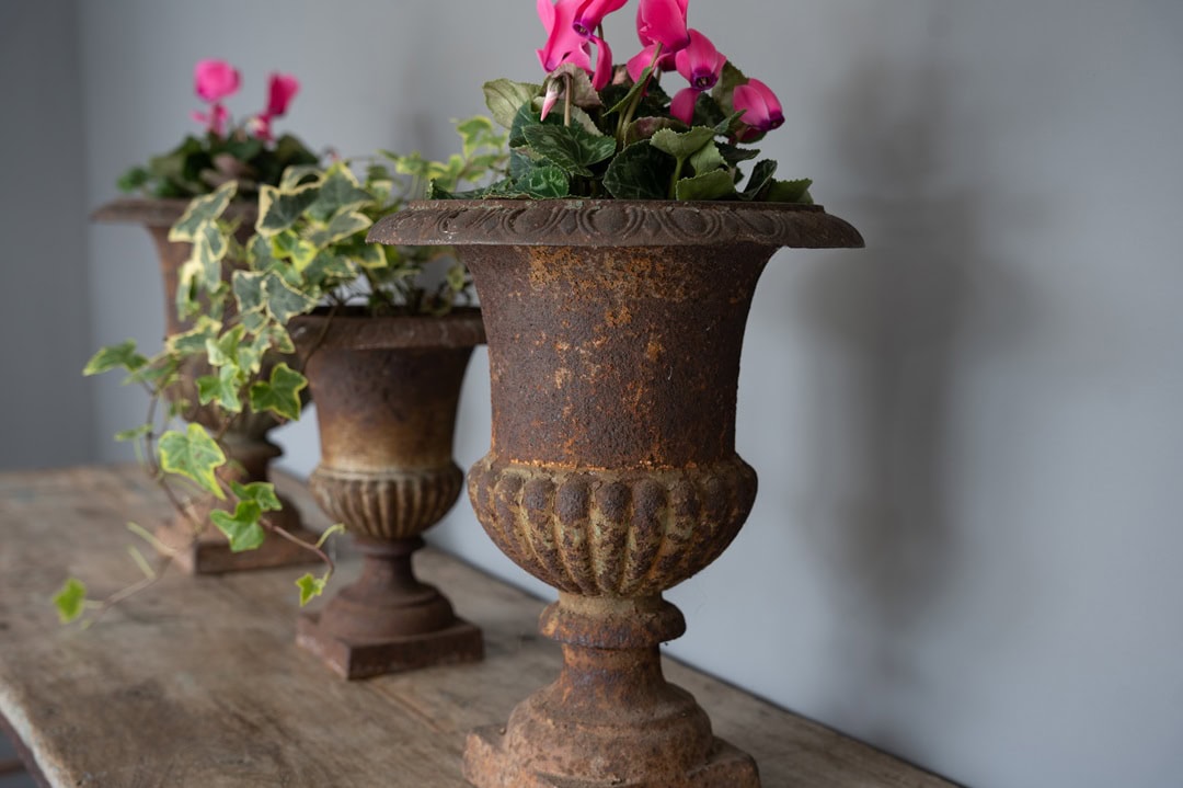 A stunning set of three charming small cast iron antique urns ideal for a tabletop or interior display. The age of these classical urns has considerably increased their beauty. Perfect for plant display and interior styling.