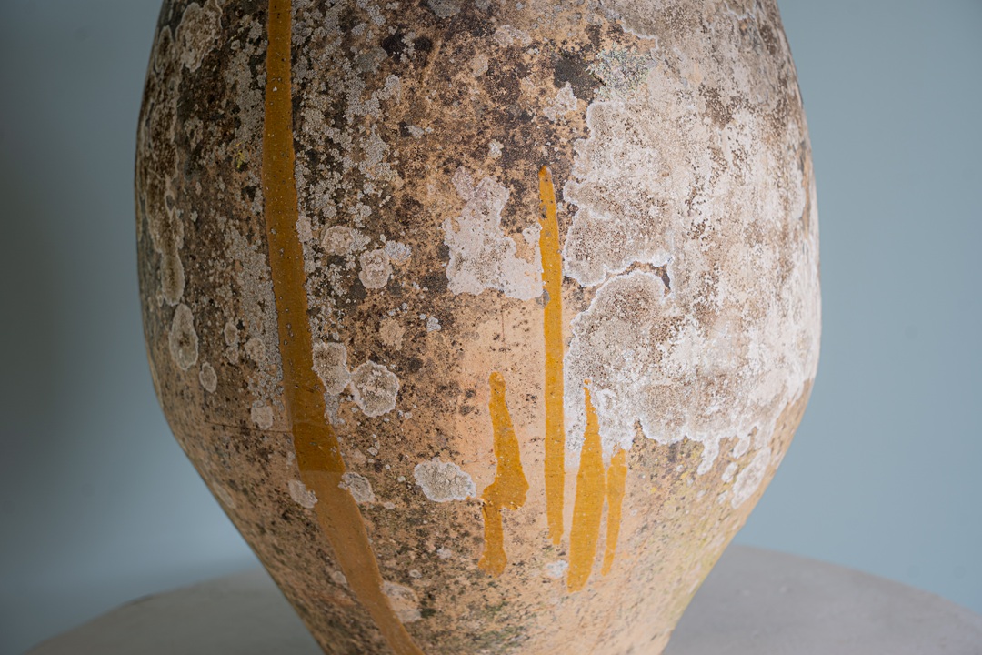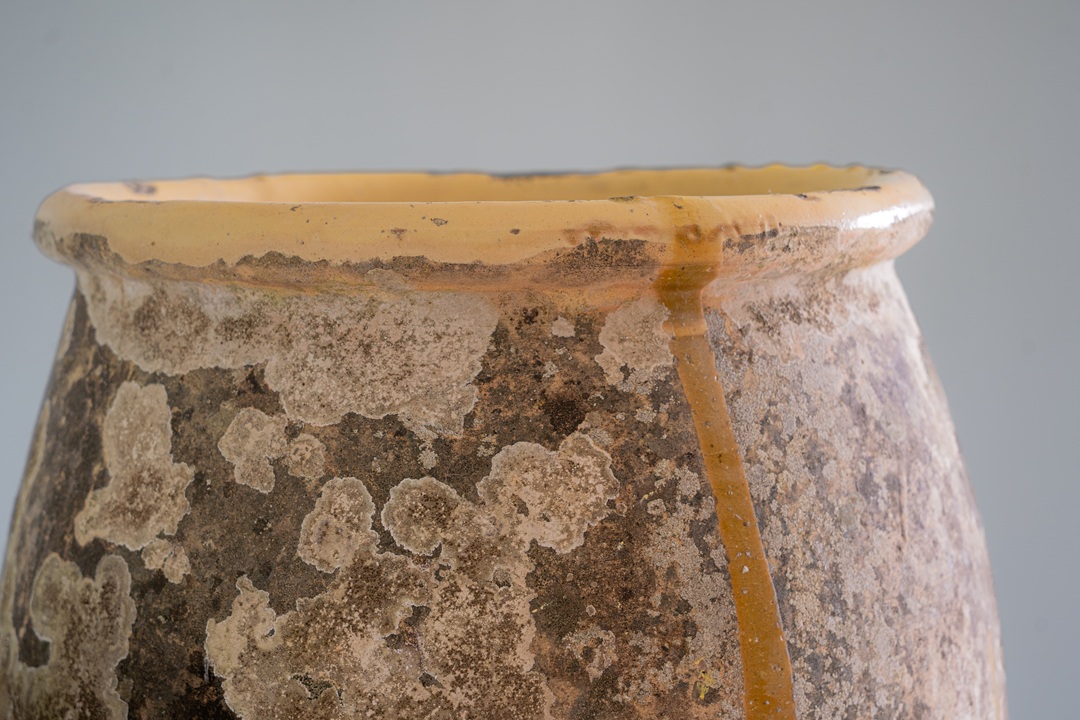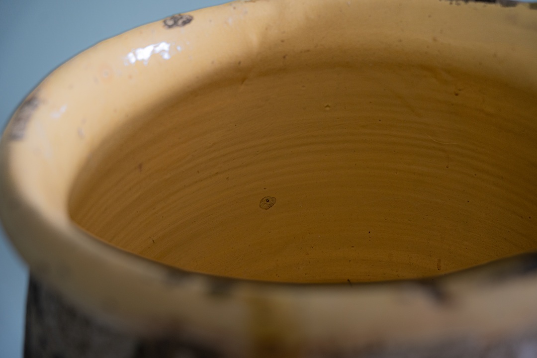 An antique French Biot with yellow glaze around the neck and internally. This large, traditional terracotta storage jar originated from the village of Biot, in the Alpes-Maritimes region of southern France. These jars have been hand-thrown by potters since at least the 16th century and were originally used for storing olive oil, wine, or grains. With its distinctive wide belly and narrow neck, this thick-walled antique vase would be a beautiful decorative piece for the home.